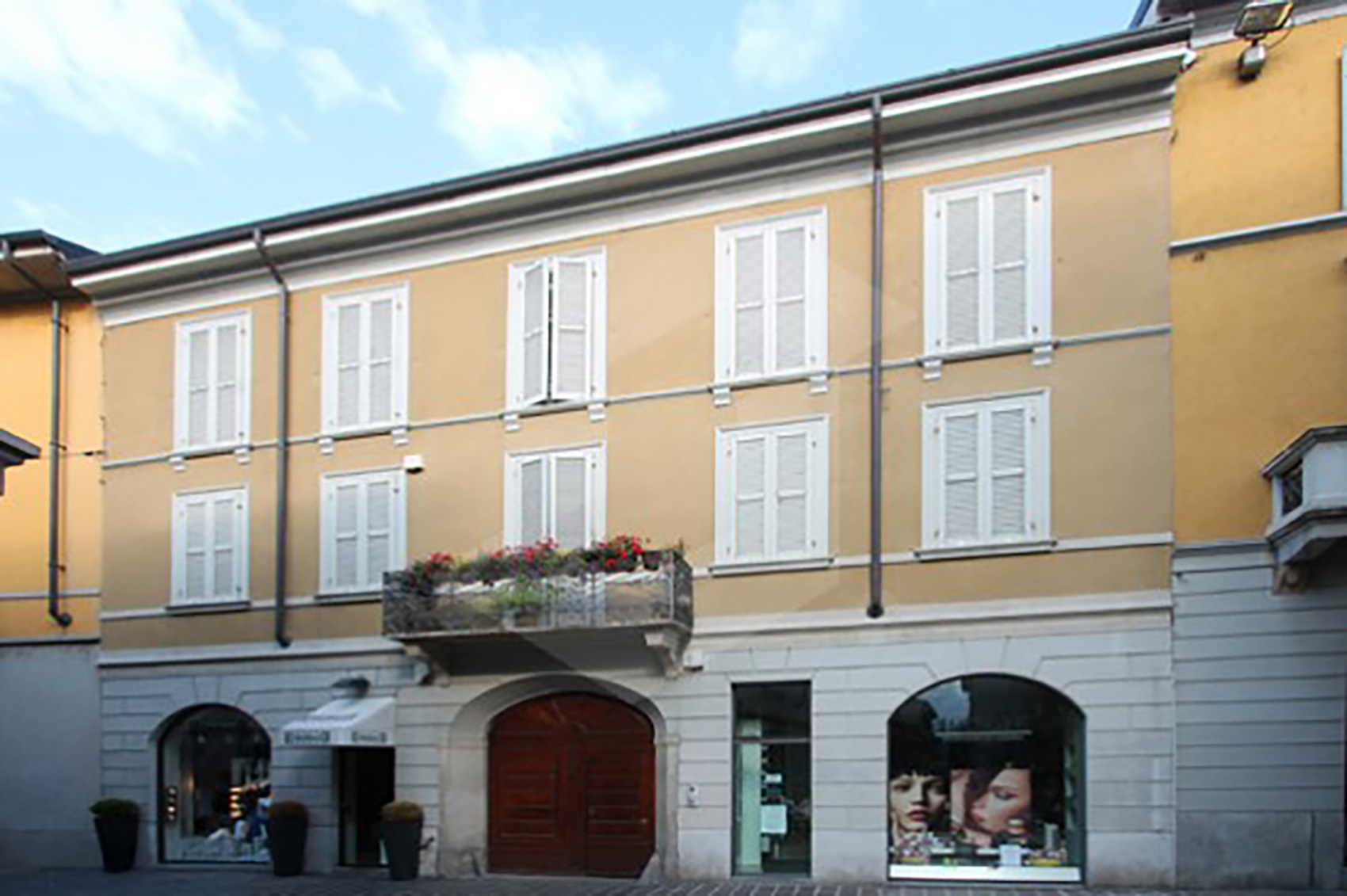 L’edificio polifunzionale viene ristrutturato, preservando il ritmo architettonico: i tre archi dei negozi al piano terreno, il balcone del primo e le cinque sobrie finestre del secondo. Non distante dai luoghi dell’aristocrazia e del clero, Casa Scanzi e San Pietro Martire, l’edificio restituisce un altro spazio decisivo per la storia monzese: quello operoso delle case con annessa bottega.
