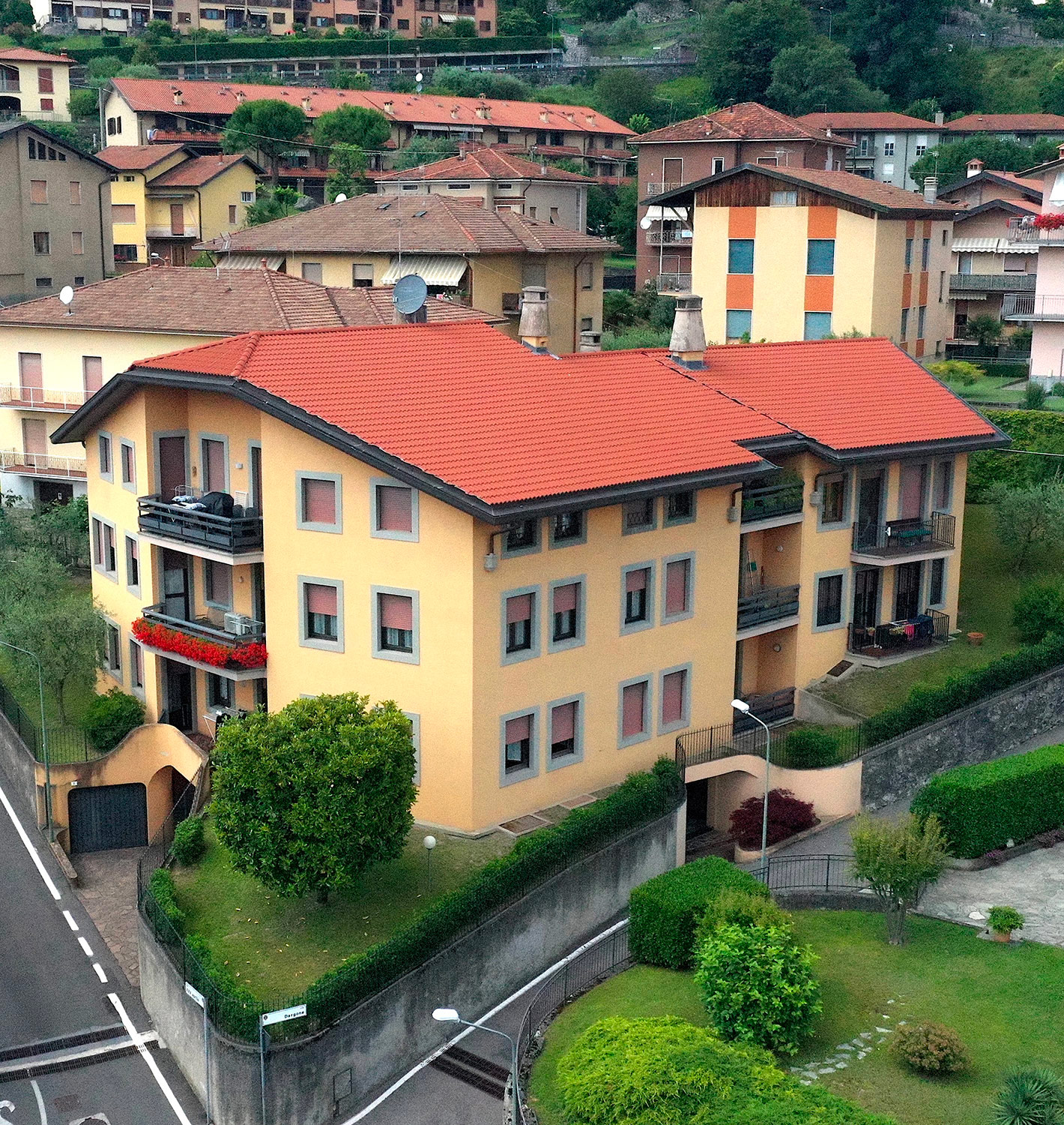 Edificio residenziale a completamento di un lotto ad angolo, che ha caratterizzato la forma dell’edificio. Lo stabile risulta arretrato rispetto al confine sulle due vie pubbliche, imponendo la composizione dell’edificio in tre “blocchi” distinti, ma ben collegati fra loro attraverso balconi e logge e mediante un’unica copertura. Trattasi di costruzione tradizionale con struttura portante, copertura in C.A. e murature intonacate. Sono stati realizzati con particolare cura i fregi architettonici, quali, ad esempio, i contorni delle finestre, i torrini dei camini in copertura e il sistema di innesto dei pluviali, che dal canale di gronda entrano all’interno della muratura di facciata.